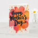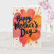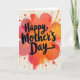On the front of the card, the words “Happy Mother’s Day” sit centered in large, dark flowing lettering, standing out clearly against the background. Behind the text, an abstract flower-like shape blooms with layered, fluid petals that feel like they’re gently opening toward one another, like a warm embrace ❤️. The color blend moves through deep coral and rosy pink into sunny orange and tangerine, with soft transitions that resemble watered paint. Around the central bloom, scattered speckles and rounded drops in reds, oranges, and pinks spread outward, adding a lively, affectionate energy. A few thin trailing streaks extend from some splatters, giving the scene a sense of motion, like confetti drifting through the air 🌼. The main canvas stays a creamy off-white, letting the warm tones glow without overwhelming the layout. Small drips and tiny dots appear near the edges, while the brightest color stays concentrated around the center flower form.