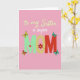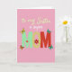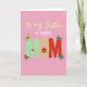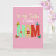 This card features a soft rosy pink background with a cheerful, affectionate layout that feels like a close hug between sisters ❤️. Near the top center, the words “to my Sister” appear in light mint green, set in smooth, flowing lettering that leans gently into the message. Just below, “a super” is written in crisp white, smaller and neatly tucked above the main word as if cheering it on. The large word “MOM” sits front and center, with each letter in a different style and color, creating a friendly, celebratory look. The first “M” is mint green with a small red heart on it, adding a quiet romantic touch to the design. The “O” is textured like shimmering gold and decorated with a tiny red flower, like a little 🌼 pinned in place. The final “M” is a warm reddish-orange, and small butterflies in yellow, orange-red, and turquoise flutter around the letters, with one above the first “M” and others clustered near the last “M.”