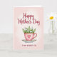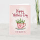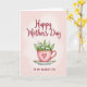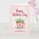 This card features a rosy pink teacup resting on a white saucer, both edged with thin gold rims and a shiny gold handle that catches the light. On the front of the cup, a pale pink heart outlined in gold sits like a quiet love note ❤️. From inside the cup, long green leaves rise upward and curl around small white, bell-shaped flowers, as if they’re leaning in close like old friends. The background is a smooth blush-to-light-pink gradient that keeps the scene soft and calm. Near the top, the words “Happy Mother’s Day” appear in deep crimson lettering, centered above the flowers. Along the bottom, “TO MY DEAREST ITA” is placed in matching crimson text, set neatly beneath the saucer. Tiny highlights along the gold edges and the gentle watercolor texture give the cup, leaves, and blossoms a delicate, airy finish 🌼.