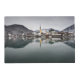 Placemat with a winter scene with the reflection of the yellow church tower in the still water of Tegernsee lake and with snow on the roofs of the houses of the town Rottach-Egern with the Alps mountains in the background in Bavaria (Bayern), Germany.