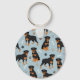 Cute Rottweiler dogs sit and stand with black and tan coats with scattered dog bones and pawprints pattern.
