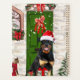 Rottweiler Dog Christmas sitting outside decorated home with Christmas wreath, Christmas tree is a perfect Christmas gift idea for dog lovers.