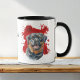 A beautiful water color portrait of a Rottweiler stands out against a bright red abstract paint splatter background. The image is on two sides of the mug, with your name or other custom text in black between them.