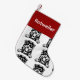 Perfect! Exactly what I ordered! I uploaded a picture of my blue chow, and the screen print was incredible. the back side of the stocking was the red and black checkered print. my puppy's name was also printed on the cuff of the stocking. PERFECT! Highly recommend this product! My puppy's name was screen printed onto the cuff of the stocking, the font was perfect!