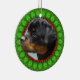 A beautiful Rottweiler decked out in a bright red and green Christmas wreath.