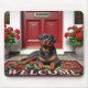 A large black and tan Rottweiler sits on a red welcome mat in front of a bright red door surrounded by flowering plants
