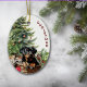 On the front of this Holiday ornament is the image an adorable Rottweiler puppy laying in his wicker basket bed in front of a decorated Christmas tree. Curved red text at the side says "CHRISTMAS". On the back, red and green text says MERRY CHRISTMAS", and there are additional text fields for you to customize to whatever you'd like.