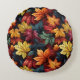 This round shape accent pillow is shown in a lovely colorful autumn leaves print.