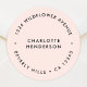 A simple, stylish custom return address label round sticker featuring a feminine soft blush pink background, a contemporary font, and a subtle dot symbol detail. Designed in a modern minimalist style, this elegant label makes the perfect finishing touch for your envelopes, packages, or personal stationery. Easily personalize it with your name and address to create a one-of-a-kind design that reflects your personal or business style. Ideal for weddings, small businesses, holiday mail, or everyday correspondence, this sleek round sticker doubles as both a return address label and an envelope seal. A timeless, professional, and beautifully simple way to elevate your mailing presentation.