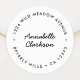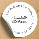 A simple, stylish custom return address label round sticker featuring a clean white background, a contemporary handwritten script font, and a subtle dot symbol detail. Designed in a modern minimalist style, this elegant label makes the perfect finishing touch for your envelopes, packages, or personal stationery. Easily personalize it with your name and address to create a one-of-a-kind design that reflects your personal or business style. Ideal for weddings, small businesses, holiday mail, or everyday correspondence, this sleek round sticker doubles as both a return address label and an envelope seal. A timeless, professional, and beautifully simple way to elevate your mailing presentation.