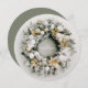 A round business holiday greeting cards features a beautiful snow flocked pine wreath decorated with white and gold Christmas tree ornaments and flowers on the front and a personalized message on the back on a green background. Be sure to double-check your order before adding it to your cart as what you see on the screen is what will be printed. The Live Design Service can help you with your design layout if needed.