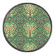 Round decorative object featuring a vibrant pattern of trees in green and brown, forming interconnected circles. The design conveys a natural, harmonious vibe.