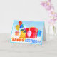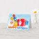 Cute, colorful 3D birthday card featuring a silly little cartoon "round" dog wearing a sparkly pointed birthday hat! The dog is surrounded by bright colorful balloons, and big wrapped presents, with confetti & streamers falling from the sky and the words "HAPPY BIRTHDAY!" beneath. Very fun! (features blue border)