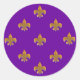 Round stickers in your choice of two sizes, with a pretty fleur de lis pattern design. The fleurs are gold, and we added a purple background, which you can customize to any color you like. The fleur-de-lis is a stylized lily (in French, fleur means flower, and lis means lily) or iris used as a decorative design or symbol. It's a symbol of all things France, and Quebec, and New Orleans and many other places.