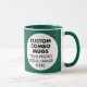 Round HUNTER GREEN double image frame custom Combo Mug for photo or logo, 11 oz., 3.2" diameter x 3.8" high, with HUNTER GREEN background double image frame (two individually customizable design areas) providing maximum coverage of the mug in HUNTER GREEN. See store for more templated font options. The background color has been chosen to closely resemble the combo mug inside and handle color but may not match exactly, due to the difference between printing and enamel tones.
