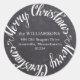 Add this round address label to the back of your Christmas card mailing and it will double as an envelope seal. The black chalkboard background will look great on any color envelope. Merry Christmas is written in a bright white script font. Your family name and address are written on the back. in a classic serif font. Easy-to-use template.