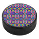 Round object with a vibrant geometric pattern in pink, blue, yellow, and purple. The design features symmetrical shapes, creating a lively, kaleidoscopic effect.