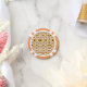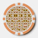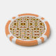 Round poker chip with an intricate floral and leaf pattern in warm colors. It features orange border segments, providing a vibrant and decorative appearance.