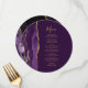 The left-hand edge of this elegant round modern wedding menu features a purple watercolor agate border trimmed with faux gold glitter. The customizable text combines gold-colored handwriting script and copperplate fonts on a rich plum background. The reverse side features a matching purple and gold agate design.