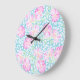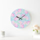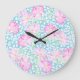 A pretty and feminine large, round Wall Clock, with a pattern of bright pink roses on a sky blue background, dotted with little white butterflies.
