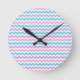 A pretty round Wall Clock, with a pattern of Turquoise Blue, Candy Pink, Light Purple and White chevrons.