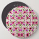 Round wall clock with a vibrant floral design featuring pink and magenta daisies on a white background. The back is plain with clock mechanics visible.