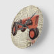 Round wall clock with image of a vintage tractor against vintage newsprint.