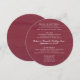 Round wedding menu with dark red wood look. The title is in the center with four sections for listing appetizers / hors d’oeuvres, salad, entrées, and dessert or whatever food items will be served at the reception or rehearsal dinner. Each section has space for up to four lines of text. Burgundy red color with white headings and center script which can hold the couple’s names, menu title and date of event. Menu items are in uppercase printed white text. Shown as the round shape, or choose square. Paper upgrades offered.