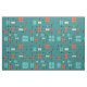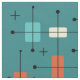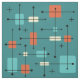 This atomic-age inspired mid century modern design has bold lines and geometric shapes in teal, turquoise, yellow and orange.