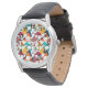 This watch has a mid-century modern design of scattered triangles, some with holes, in retro colors.