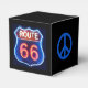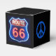 This black square classic-style favor box with its image of a Route 66 red, white and blue neon sign, is appropriate for a 20s, 40s, and 60s decade party! The sides have an image of a royal blue peace symbol. U.S. Route 66 (also known as the Will Rogers Highway after the humorist, and colloquially known as the "Main Street of America" or the "Mother Road") was a highway within the U.S. Highway System. One of the original U.S. highways, Route 66 was established in November 1926- with road signs erected the following year. It was recognized in popular culture by both a hit song originally recorded by the Nat King Cole Trio in 1946, and the Route 66 television show in the 1960s.