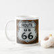 Photograph of a route 66 sign mounted on a wood building. Design printed on both sides of mug.