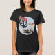 Route 66 sign with white 1961 Chevrolet Corvette, and line with states to show where the road runs. This iconic road runs East to West from Chicago, Illinois to Santa Monica, California. Even though Route 66 itself doesn't technically exist anymore, about 85% of it is still drivable to this day!