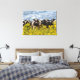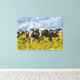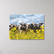This wrapped canvas features a row of black and white cows standing behind a barbed wire fence with bright yellow weeds in the foreground and a turbulent blue-gray sky behind. It would be a perfect pop of color wherever you display it.