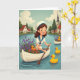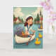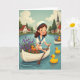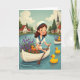This card shows a youthful figure with wide, expressive eyes and a bright smile, dressed in a sailor-style outfit with a white hat and a blouse trimmed with a blue collar, drifting a small white rowboat across calm blue water 🌷. The boat looks like a floating garden, packed with purple blooms and orange flowers that spill over the edges and soften the scene with a gentle, affectionate air. Her hands rest steadily on a slender oar, and her relaxed posture suggests she’s enjoying the quiet company of the little creatures nearby. Along the side of the boat, several small yellow duck-like birds with orange beaks bob close, as if tagging along like friendly companions 🐇. In the distance, a second flower-filled boat glides farther down the canal, paired with its own tiny yellow follower. Across the water sits a quaint village of cream-colored houses with reddish-brown roofs, and a tall church steeple rises near the shoreline under a pale sky with rounded clouds. Near the top of the design, a short greeting appears in a simple, dark-colored font, centered above the illustration.