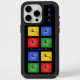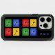 This phone case has a space for you to add a name or other text. (The default is "Row with the Flow".) Also add your initials, top right. The design features colorful icons (red, yellow, green, blue) with a rower in silhouette.