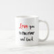 A rower's mug for Valentine's day or any romantic occasion. On one side, the text is "Love you to the river and back". On the other side is a pictogram-style image of a single rower with a red heart.
