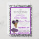 African American Princess with adorable afro puff ponytails wearing dark purple tutu with a white rose embellishment; diamond earring and diamond tiara on a white carnation floral and silver glitter background. Great for a purple princess themed baby shower. ©2023 Miss Sassy Party Designs
