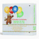 A prince of a teddy bear all decked out in a colorful jeweled crown holding a bunch of colorful balloon with letters on them that spell out PARTY is a festive 1st birthday memory album. Personalizing with your child's name, age, date and other party information makes it an extra special scrapbook to be filled with keepsakes and photos. We specialize in custom-made designs, so contact us if you would like a unique made-to-order layout using this basic royal teddy bear design for your kid's memorable birthday celebration.