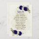 Beautiful romantic seating chart card featuring royal blue and beige flowers and some leaves .