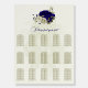 Beautiful romantic wedding seating chart foam board featuring royal blue and beige flowers and some leaves .