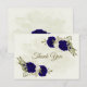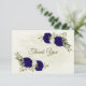 Beautiful romantic wedding thank you card featuring royal blue and beige flowers and some leaves .