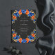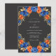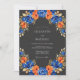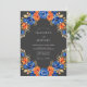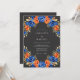 This dramatic design features a striking contrast between a deep charcoal backdrop and vibrant botanical illustrations. Saturated royal blue roses and burnt orange poppies create a high-energy aesthetic perfect for a bold evening ceremony. Lush golden foliage weaves through the floral arrangement, adding a touch of opulent warmth to the moody color palette.