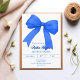 A white background, decorated with a large royal blue bow. Personalize and add a name and party details.