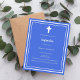 A royal blue background, decorated with a white frame, and a white cross Personalize and add the name and details. White text.