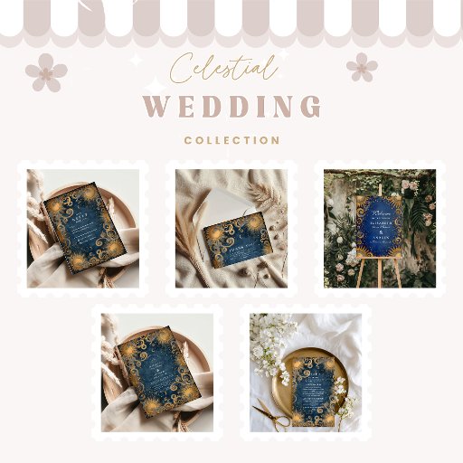 This Royal Blue Celestial Wedding design evokes the grandeur of the cosmos with rich sapphire tones, swirling golden sunbursts, and intricate baroque detailing. Perfect for couples who love a regal yet mystical atmosphere, it blends celestial beauty with old-world opulence. Ideal for luxury weddings, astrology-inspired ceremonies, or evening celebrations under the stars.