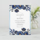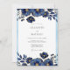 Deep royal blue watercolor anemones are accented with delicate gold metallic outlines to create a sophisticated aesthetic. Lush navy leaves and buds sit at the top and bottom of the clean white layout for a refined look. This botanical artwork features a moody yet elegant palette, ideal for a formal evening or winter event.