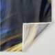 This pattern features a breathtaking fusion of royal blue and gold, masterfully intertwined to form an abstract swirl pattern that captivates the eye. This dynamic composition exudes an organic quality, reminiscent of natural landscapes, where the flowing lines and curves suggest the gentle undulations of hills and valleys. The interplay of colors is further enhanced by the inclusion of beautiful, iridescent metallic tones that shimmer and shift with the light, creating a mesmerizing visual experience. This image is AI generated.