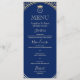 Elevate your reception tables with this royal blue and gold elegant wedding menu, designed to add a refined and timeless touch to your celebration. Featuring a deep navy blue background, metallic gold accents, classic typography, and a sophisticated monogram crest, this menu card blends modern elegance with a regal, formal aesthetic.