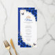 Royal blue, gold and white Quinceanera celebration slim menu card. Features, script font, gold butterflies, watercolor roses and tiara. Perfect for an elegant princess style glam celebration. Personalize with your own details.